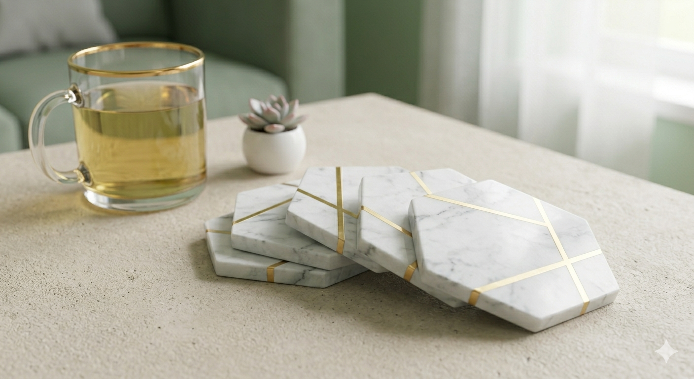 A set of six polished Carrara white marble coasters with elegant brass inlay strips. They add instant luxury to any coffee table, bridging the gap between traditional Pakistani marble craftsmanship and modern design.